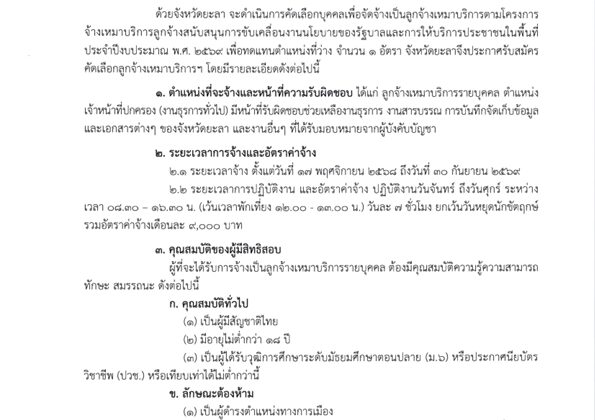 - ประกาศรับสมัครคัดเลือกลูกจ้างเหมาบริการรายบุคคล โครงการจ้างเหมาบริการลูกจ้างสนับสนุนการขับเคลื่อนงานนโยบายของรัฐบาลและการให้บริการประชาชนในพื้นที่ ประจำปีงบประมาณ พ.ศ. 2569 จำนวน 1 อัตรา