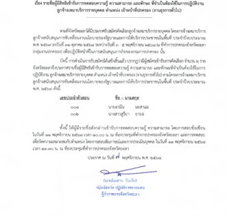 - ประกาศรายชื่อผู้มีสิทธิเข้ารับการทดสอบความรู้ ความสามารถ และทักษะ ที่จำเป็นต้องใช้ในการปฏิบัติงานลูกจ้างเหมาบริการรายบุคคล ตำแหน่ง เจ้าหน้าที่ปกครอง (งานธุรการทั่วไป)