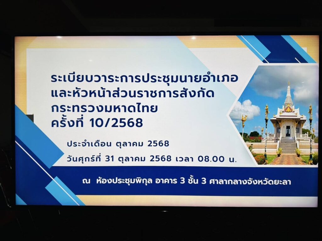 วันศุกร์ ที่ 31 ตุลาคม 2568 ตั้งแต่เวลา 08.00 น. นายโอฬาร บิลสัน ปลัดจังหวัดยะลาเข้าร่วมประชุมนายอำเภอและหัวหน้าส่วนราชการสังกัดกระทรวงมหาดไทย ประจำเดือนตุลาคม 2568 โดยมี นายก้องสกุล จันทราช รอง ผวจ.ยะลา เป็นประธาน มี รอง ผวจ.ยะลา หัวหน้าส่วนราชการ/หัวหน้าหน่วยงานรัฐวิสาหกิจ นายอำเภอ/ผู้แทน ส่วนปฏิบัติการจังหวัดชายแดนใต้ ศูนย์สื่อสารฯ ปค.เขต 13, ศูนย์บริหารการทะเบียนภาค 9 สาขาจังหวัดยะลา และเจ้าหน้าที่ที่เกี่ยวข้อง เข้าร่วมฯ ณ ห้องประชุมพิกุล อาคาร 3 ชั้น 3 ศาลากลางจังหวัดยะลา