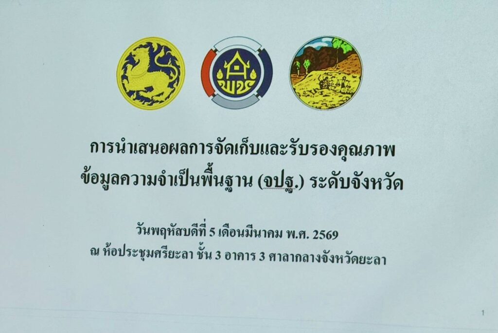 วันพฤหัสบดีที่ 5 มีนาคม 2569 ตั้งแต่เวลา 09.00 น. ผู้ว่าราชการจังหวัดยะลา มอบหมายให้นายโอฬาร บิลสัน ปลัดจังหวัดยะลา เป็นประธานการประชุมนำเสนอผลการจัดเก็บและรับรองคุณภาพข้อมูลความจำเป็นพื้นฐาน (จปฐ.) ระดับจังหวัด เพื่อนำข้อมูลดังกล่าวไปใช้ประโยชน์ในการวางแผนการพัฒนาคุณภาพชีวิตของประชาชนในพื้นที่จังหวัดยะลา จัดโดย สนง.พัฒนาชุมชนจังหวัดยะลา โดยมีผู้แทนพัฒนาการจังหวัดยะลา, หัวหน้าส่วนราชการที่เกี่ยวข้อง/ผู้แทน, ผู้แทนนายอำเภอ, พัฒนาการอำเภอ, ข้าราชการ เจ้าหน้าที่หน่วยงานต่างๆ เข้าร่วม ณ ห้องประชุมศรียะลา อาคาร 3 ชั้น 3 ศาลากลางจังหวัดยะลา อ.เมืองยะลา จ.ยะลา