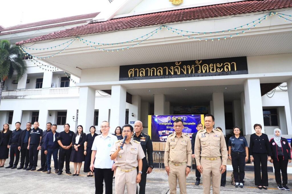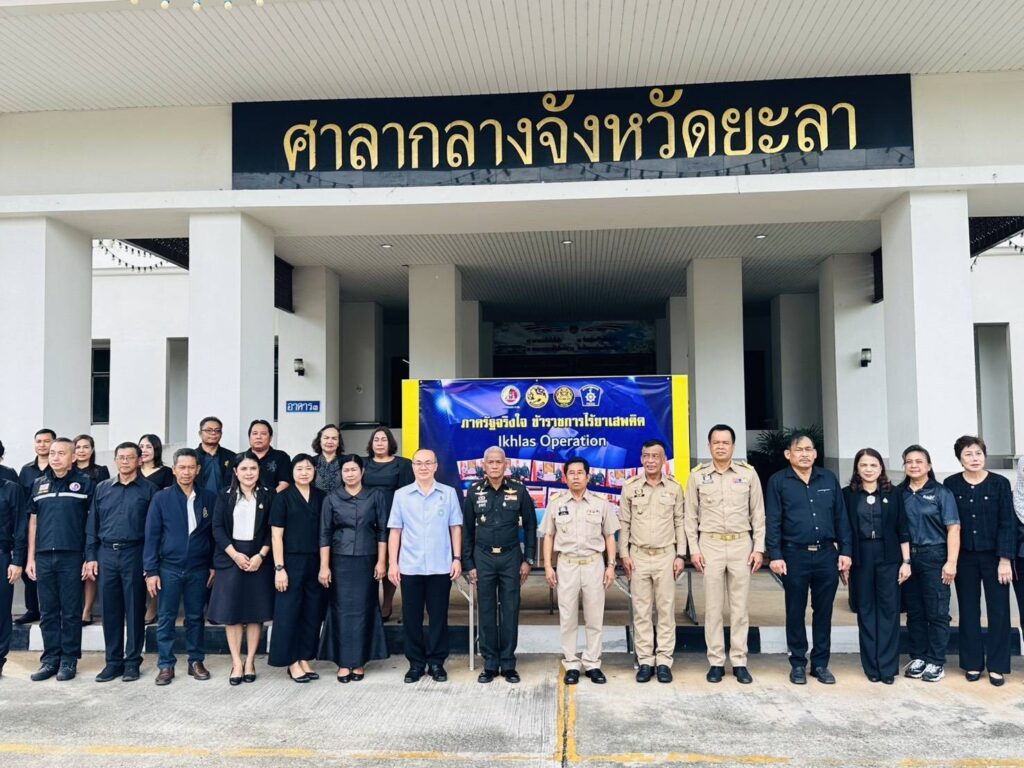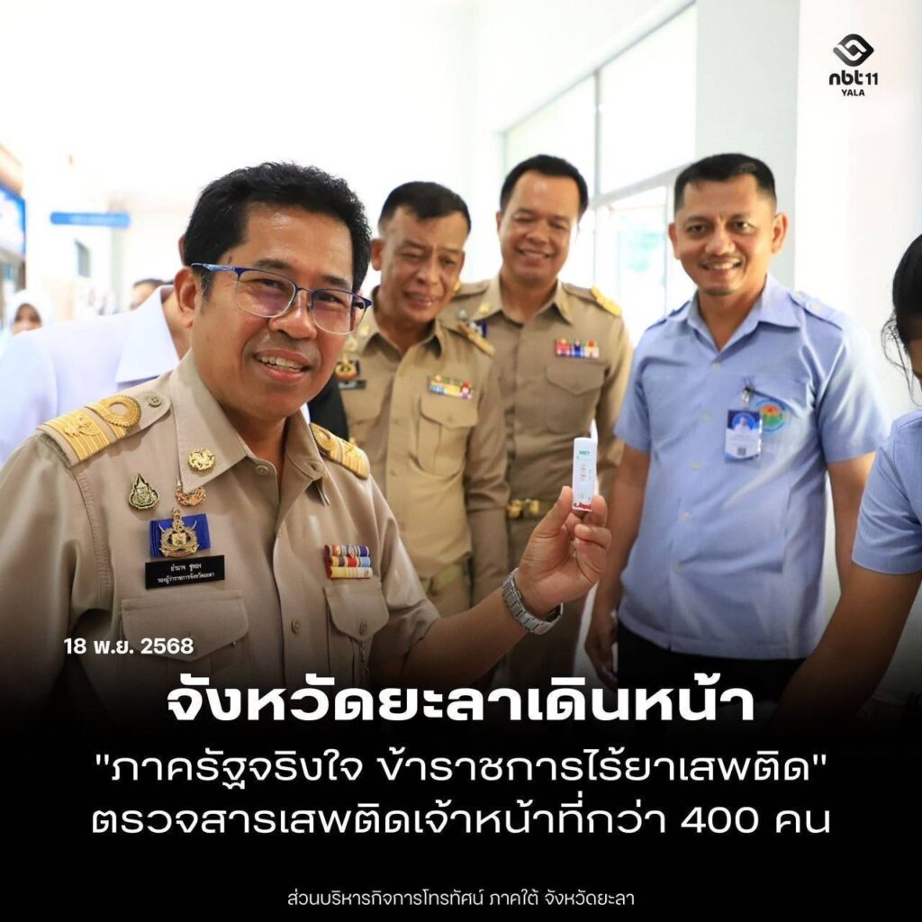 วันอังคารที่ 18 พฤศจิกายน 2568 เวลา 08.30 น. นายโอฬาร บิลสัน ปลัดจังหวัดยะลา เข้าร่วมพิธีเปิดกิจกรรม “ภาครัฐจริงใจ ข้าราชการไร้ยาเสพติด” โดยมี นายอำนาจ ชูทอง รอง ผวจ.ยะลา รักษาราชการแทนผู้ว่าราชการจังหวัดยะลา เป็นประธานมีหัวหน้าส่วนราชการ ปลัดจังหวัดยะลา หัวหน้าหน่วยงานข้าราชการ สมาชิก อส. และเจ้าหน้าที่ที่เกี่ยวข้องเข้าร่วมฯ ณ บริเวณหน้าอาคาร 3 ศาลากลางจังหวัดยะลา โดยการนำข้าราชการและเจ้าหน้าที่ ทุกส่วนราชการในศาลากลางจังหวัด และบริเวณใกล้เคียงเข้ารับการตรวจปัสสาวะหาสารเสพติด เพื่อแสดงความโปร่งใสและสร้างความเชื่อมั่นให้กับประชาชน ซึ่งกิจกรรมดังกล่าวเป็นส่วนหนึ่งของโครงการที่กอ.รมน. ภาค 4, ศูนย์อำนวยการบริหารจังหวัดชายแดนภาคใต้ (ศอ.บต.),ตำรวจ และฝ่ายปกครอง ร่วมบูรณาการขับเคลื่อนการแก้ไขปัญหายาเสพติดในพื้นที่ จชต. ตามนโยบายของรัฐบา