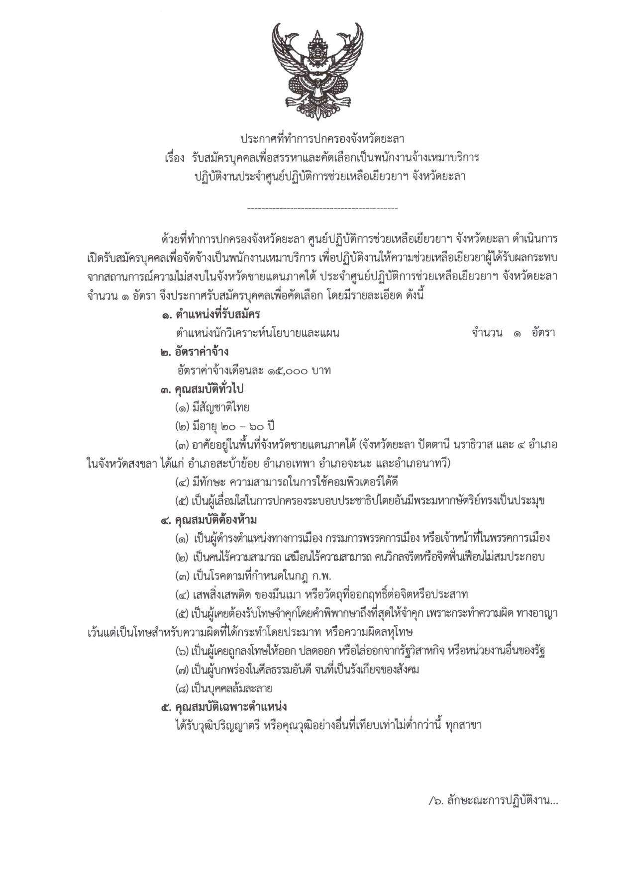 ประกาศที่ทำการปกครองจังหวัดยะลา เรื่อง รับสมัครบุคคลเพื่อสรรหาและคัดเลือกเป็นพนักงานจ้างเหมาบริการ